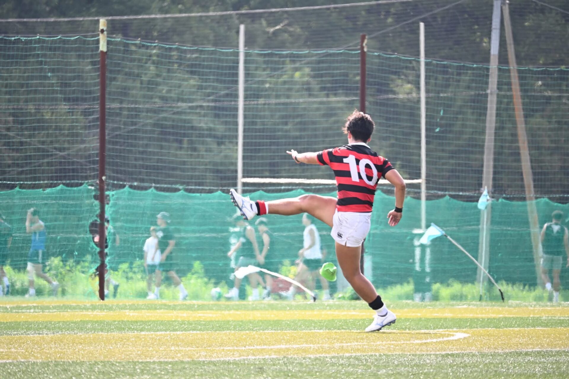 試合が動いたのは後半18分。10番松尾がクロスキックで敵陣深くに攻め込み、そのままターンオーバー。3番髙田のビックゲインの後、4番三添が飛び込み公式戦初トライ。 (一橋22ー5大阪公立) 10番松尾も難なくキックを決める。 (一橋24ー5大阪公立)