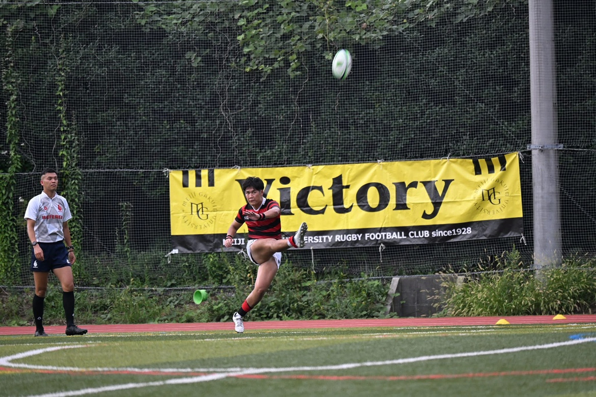 しかし、明治学院側にもミスがみられるようになり、前半31分、一橋がアドバンテージを獲得してキックで陣地を稼ぎ、敵陣タッチライン5m手前でLOから再開すると、ますはモールで攻め込み、最終的には主将である#8菊地がトライまでつなげました。角度のある難しい位置からのコンバージョンでしたが、#10松尾が無事に決めきり、点差を縮めます。 (一橋7‐21明治学院)