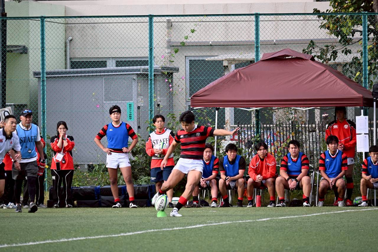 後半40分、敵陣トライライン付近でのペナルティキックを獲得し、ペナルティゴールを選択。#10松尾が決め(一橋 37ー26 成城)ここで時間になりノーサイドとなりました。