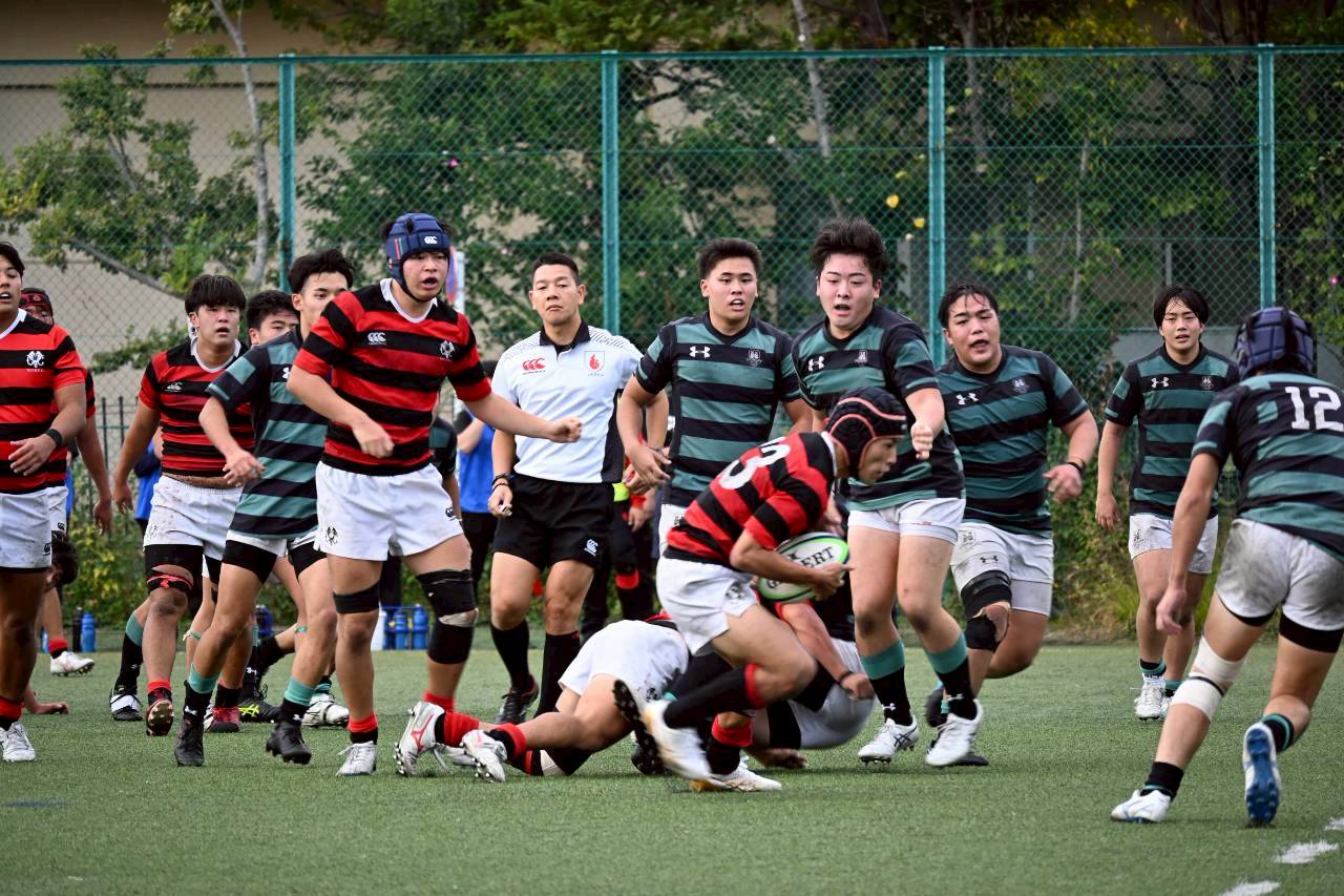 後半6分、トライライン付近での#6菊地がタップ&ゴーでスタートし、FW陣がピックで押し込み#1島村がゴール左にトライ。コンバージョンは失敗。後半でも一橋が先制点を獲得することができました。(一橋 12ー14 成城)
